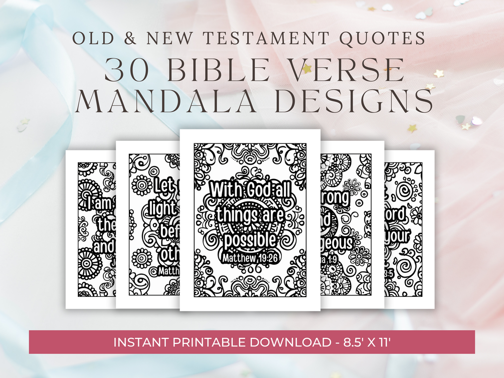 Discover a beautiful collection of 30 unique Bible verse mandala coloring pages, perfect for both spiritual reflection and artistic expression. This printable and digital download features inspirational quotes from the Old and New Testaments, paired with intricate abstract floral motifs, sized at 8.5 x 11 inches. Whether you’re seeking a peaceful activity for relaxation or a meaningful way to engage with Scripture, these designs are perfect for coloring and contemplation.